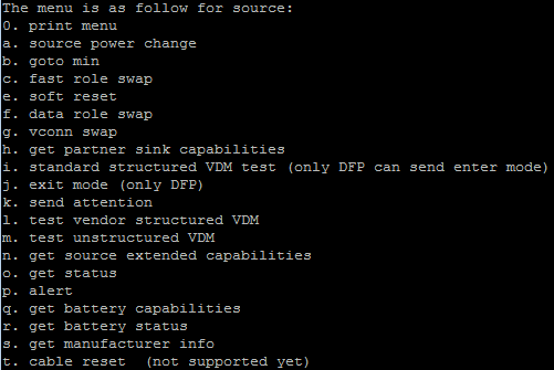 Input ‘0’ in the debug console. The following menu is printed in the debug console (the menu is a little different for source and sink):