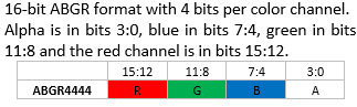 Attention: OpenVG VGImageFormat Note: The bits for each color channel are stored within a machine word from MSB to LSB in the order indicated by the pixel format name. This is the opposite of the original VG_LITE_* formats that are ordered from LSB to MSB. The formats with the same organization are listed in the same row as their VG_Lite counterparts.
