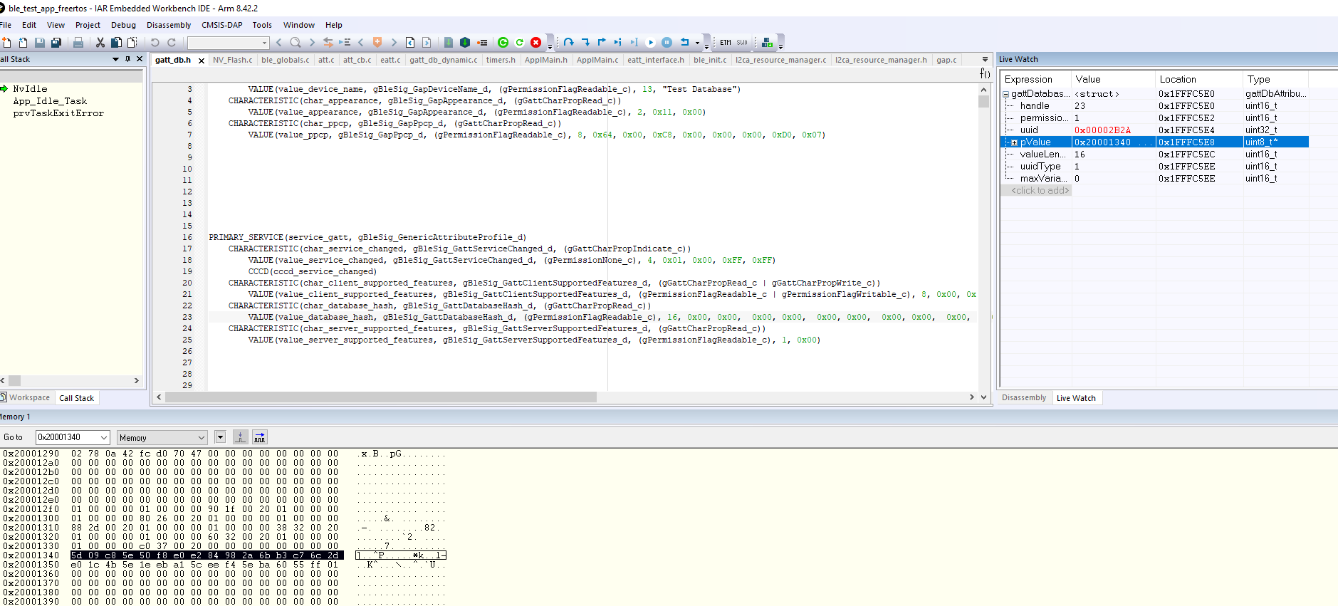 For static databases, hash computation is disabled by default. If you have a static database and want to compute the database hash, then declare the following define to TRUE in app_preinclude.h: gGattDbComputeHash_d. By doing this, the hash value is computed during the host initialization. The value is written directly to the database as characteristic and it can be viewed in the memory, as see in the image below. Since static databases do not change in structure over time, this value remains constant, so it can be saved separately and written manually to memory if needed. See Figure 10 below.