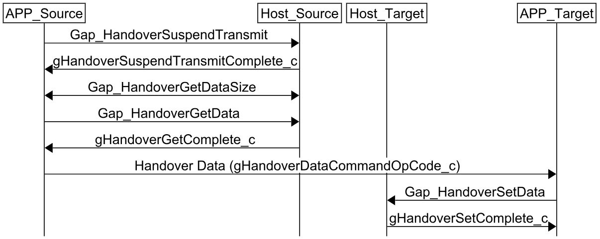 gHandoverSuspendTransmitComplete_cevent is received, the Handover Data may be retrieved usingGap_HandoverGetData(). The application must provided memory for the Handover Data. To obtain the required data size, use the functionGap_HandoverGetDataSize().Wait for the