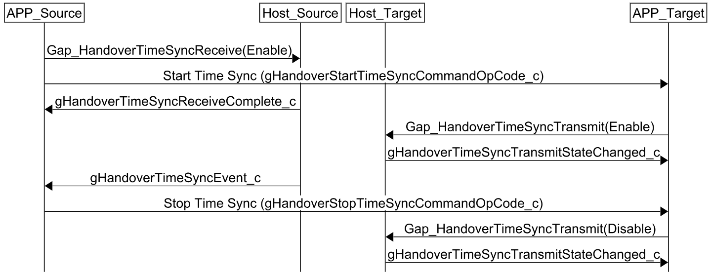 To start the time synchronization procedure, one of the devices must call GAP_HandoverTimeSyncReceive() and the other device must call GAP_HandoverTimeSyncTransmit(). Either device, Source or Target, can initiate the procedure. The Connection Handover application common module initiates the procedure on the Source device by calling the Gap_HandoverTimeSyncReceive() function.