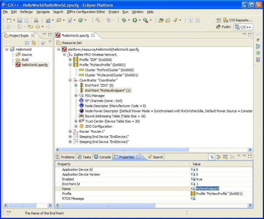 **Step 2:**Add Routers and End Devices in the same way, as required. The network can only have one Coordinator, but as many different Router or End Device types (that is, running different application features and with different endpoints) as required.