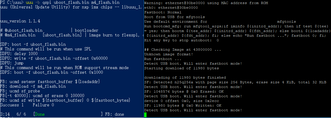 uuu -b qspi m4_flash.bin.The UUU puts the platform into fast boot mode and automatically flashes the target bootloader to QSPI. The command line and fast boot console is as shown in Figure 2.