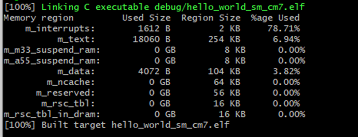 build_debug.shscript at the command-line to perform the build. The output is shown as below:$ ./build_debug.sh -- TOOLCHAIN_DIR: -- BUILD_TYPE: debug -- TOOLCHAIN_DIR: -- BUILD_TYPE: debug -- The ASM compiler identification is GNU -- Found assembler: -- Configuring done -- Generating done -- Build files have been written to: Scanning dependencies of target hello_world.elf < -- skipping lines -- > [100%] Linking C executable debug/hello_world.elf [100%] Built target hello_world.elf