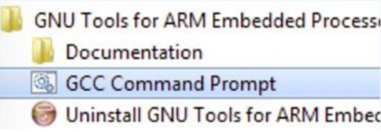 Open the GCC Arm embedded toolchain command window. To launch the window on the Windows operating system, select Start-> Programs-> GNU Tools ARM Embedded <version>-> GCC Command Prompt.